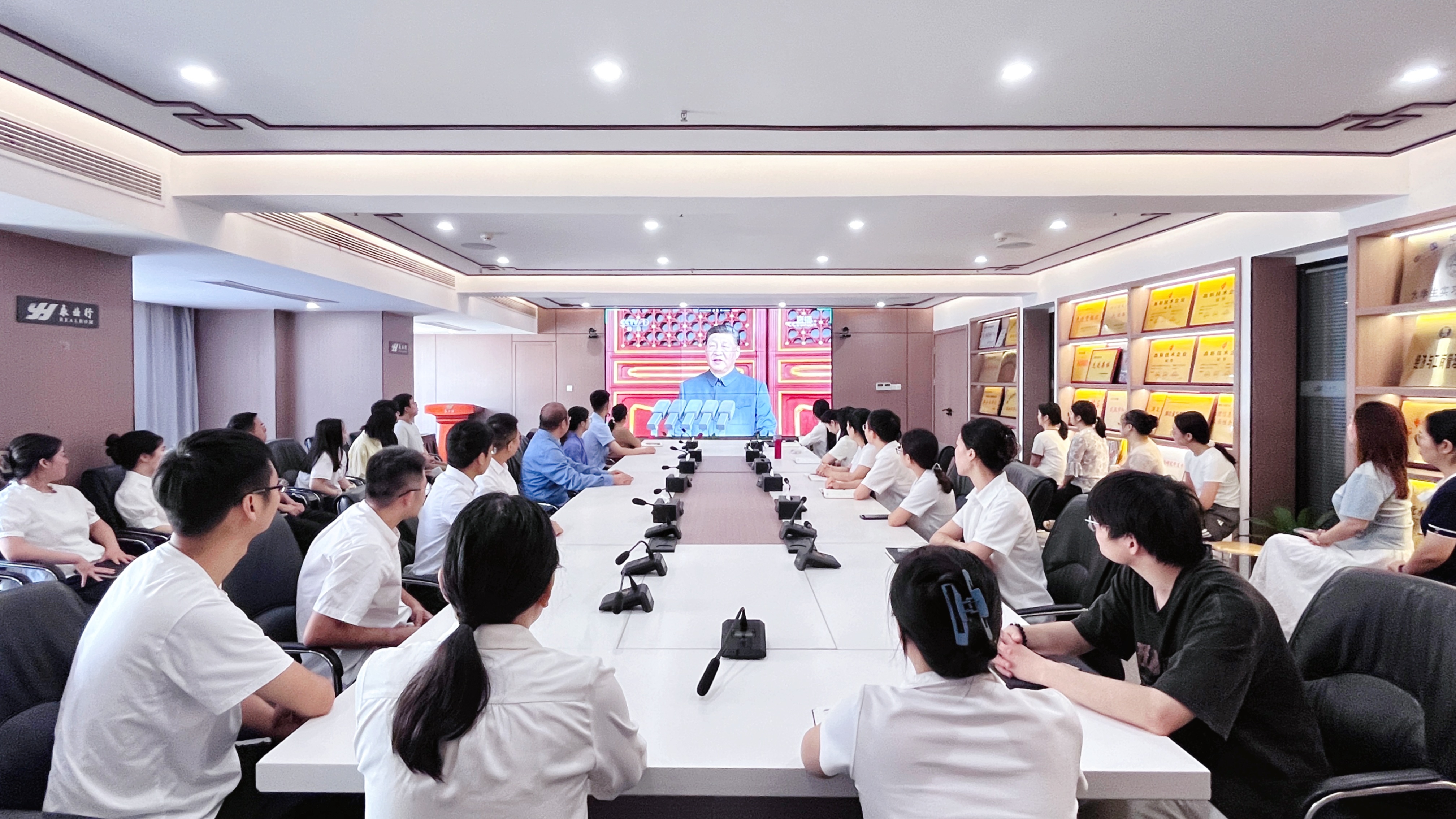 上午9时,直播正式开始。当雄壮的国歌响彻天安门广场,会议室内的全体人员肃然起立,齐唱国歌,歌声激荡着每个人的爱国之心。随后,中共中央总书记、国家主席、中央军委主席习近平发表重要讲话,深刻回顾了中国人民抗日战争和世界反法西斯战争的伟大历程,强调“铭记历史、缅怀先烈、珍爱和平、开创未来”的时代使命。习近平总书记的话语字字千钧,引发在场员工的强烈共鸣,大家深刻感受到和平的珍贵与责任的重大。